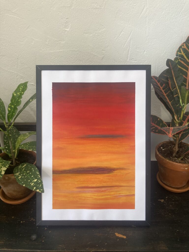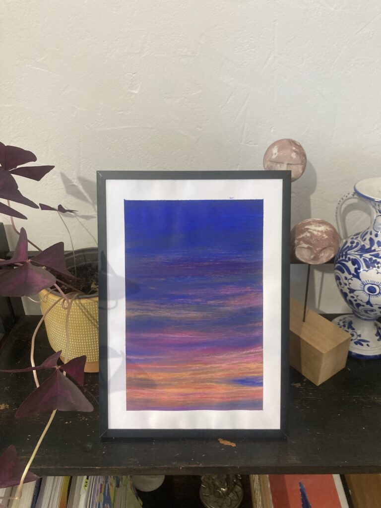 À travers la série Rêves, je travaille le ciel en cherchant à saisir l’éclat d’un instant et sa disparition presque immédiate. Ces œuvres originales de petit format prennent la forme de dégradés colorés semi-abstraits, où Le pastel à l’huile et la feuille d’or me permettent de travailler la lumière comme une matière à part entière, sur un fond réalisé en peinture acrylique.
